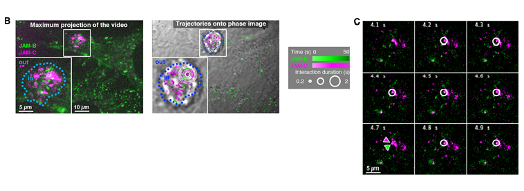 (B) Maximum projection of a 500-frame videonanoscopy acquisition, showing JAM-B and JAM-C positions over time (left). Maps of JAM-B and JAM-C trajectories represented by gradients of green and magenta, respectively, according to time, and superimposed on the transmission image of the cells (right). Inserts show magnifications of the framed areas. Spatiotemporal colocalizations are denoted by white circles with a size proportional to duration. Several concentric circles correspond to successive colocalizations at a nearby locations but with different durations. (C) Images from the same videonanoscopy acquisition corresponding to the area framed in B, with colocalization events or not (white circle or green/magenta arrowheads, respectively).