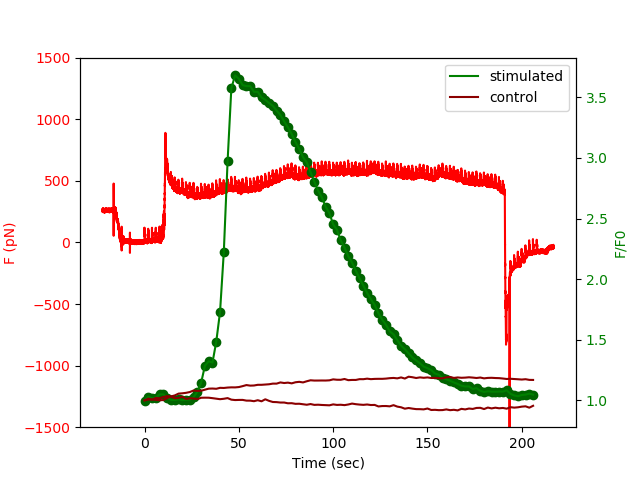 Fig: Simultaneous recording of forces (red) and calcium fluxes (green) as a function of time for a Fluo4 loaded Jurkat T cell. Fluorescence of non contacted cells in brown.