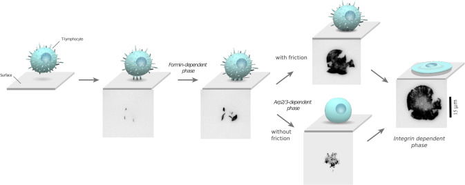Sequence of ligand recognition and spreading phases. Schemes (not to scale) show T cell morphology, and micrographs show labeled actin cytoskeleton (GFP-lifeact, TIRF mode) as a T cell undergoes adhesion to a ligand-covered surface.