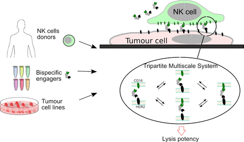 Original bispecific engager molecules are being tested to recruit immune cells from healthy donors to kill tumour cells. Donor and molecule parameters are decoupled and the multi-scale model predicts the optimal dose required to kill in vitro (Credit: L. Limozin).